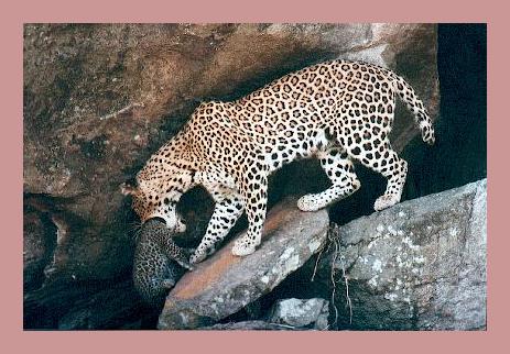 In October 1997 Half Tail had again given birth to two cubs, and again as with the last litter in the leopard canyon. Unfortunately no long and beautiful leopard's life was granted to these cubs. A few weeks later a strange male leopard about 3 years old (not the cubs' father) passed through this area and discovered the two young leopard children only a few weeks old in their cave and killed them in the absence of their mother. When Half Tail returned some time later and discovered the strange leopard a fierce fight broke out in the course of which the male fell from a tree about ten meters deep and then disappeared. Of lions it is known that strange males kill the little ones of the females when taking over a pride of lionesses. With leopards this had never been observed until then, probably because of these cats' more secretive way of living.