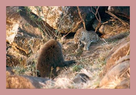 Here Paradise had made her home and here she made a mistake in the summer of 1992. Until that date she had never attracted any particular attention -apart from her familiarity so pleasant for us visitors. But her nonchalance and lightheartedness induced her to attack -in broad daylight on a rocky plateau almost exactly halfway between the fig tree alley and the leopard gorge - a large herd of baboons killing a young one. That angered the male baboons of this group so much that all of them fell full of anger - upon Paradise biting off in a concerted action part of her beautiful long tail. For moments one saw nothing but a tangle of leopard dots and five or six big male baboons rolling around on the ground in a cloud of dust before Paradise could free herself and take refuge on a high tree -- she had gotten away, yet only with half of her tail left