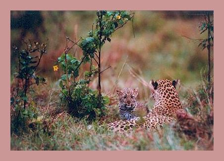 In early October 1998 one morning at about 7 o'clock in the area around the Kichwa Tembo bush Half Tail came towards me carrying a young warthog in her mouth, wandering with determination and in a straight line through the Savanna. After about half an hour's wandering she reached a deep ditch, disappered in the same, reappeared on the opposite side and right away a little leopard, about three months old, came running towards her, greeted his mother, played with her and subsequently drank mother's milk. Only well over half an hour later a second little leopard appeared, very shy, very careful. He did not drink any milk in the open terrain like his brother or sister, but his mother had to seek the protection of the bush for him to drink. We later on dubbed this young male Wasiwasi which means shy and his sister who during the next weeks showed herself as being courageous and more lighthearted we called Shujaa which means strong and determined.