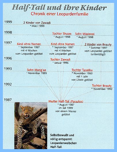 In December 1996 Half Tail had a nasty experience. A young Maasai aged about 20 wounded her seriously with an arrow which got stuck in her head. The park rangers had a veterinary flown in from Nairobi who put her to sleep with a stunning gun and then removed the arrow. The rangers shot a Thompson gazelle and put it near the stunned leopardess to provide her with food for the first days after coming round. Half Tail was in luck: the wound healed without any problem and after a couple of weeks there was nothing more to be seen of this injury. The young Maasai was excluded from the village community because of this deliberate action.